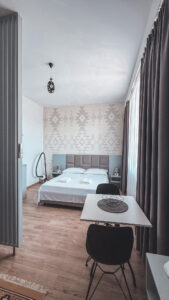 Start your Albanian adventure in Tirana at Arka Art Hotel, a stylish and relaxing stay just a short drive from the city center. In my opinion, one of the best places to stay in Albania. The hotel features an amazing infinity pool and a rooftop bar/restaurant with stunning views, perfect for unwinding after a day of exploring. Comfortable rooms, modern amenities, and a peaceful setting make it an ideal base for your Tirana adventure.